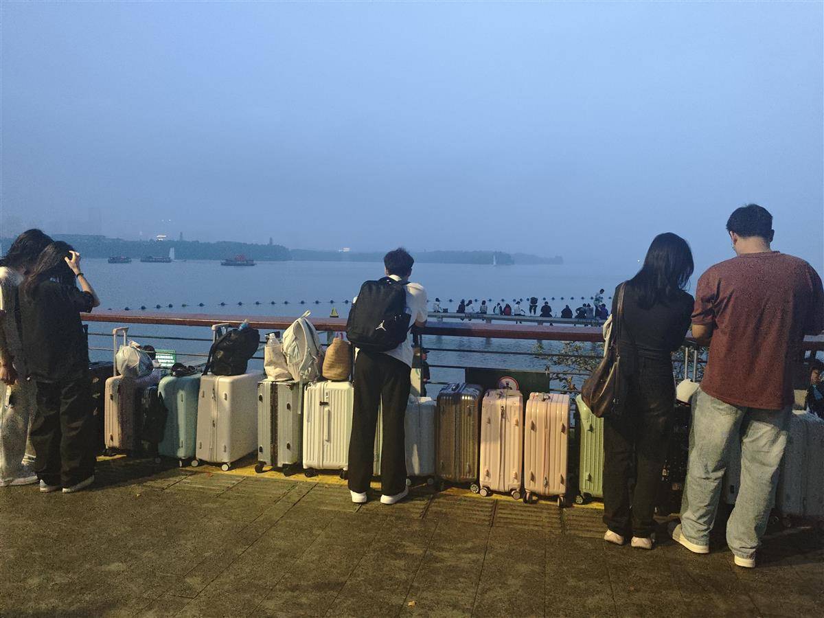 当天清晨,凌波门观景点早早聚集起千名游客,不少是连夜赶来的外地游客,行李箱在入口处摆放成一长排。“我们凌晨3点多到武汉,就直接打车过来了,没想到这里还有演唱活动,千帆竞发的场面非常壮观,结束后打算直接去东湖边的湖北省博物馆继续玩。”西安高校学生余同学说。广东游客梁楚玲则与祖国同天生日,浓厚的节日氛围让她不免哽咽:“今年我的农历生日正好在十一当天,和这么多人一起合唱国歌时,眼睛不免有些湿润,自豪之情油然而生,在武汉的第一天就收获了太多惊喜与感动,祝福祖国!”
